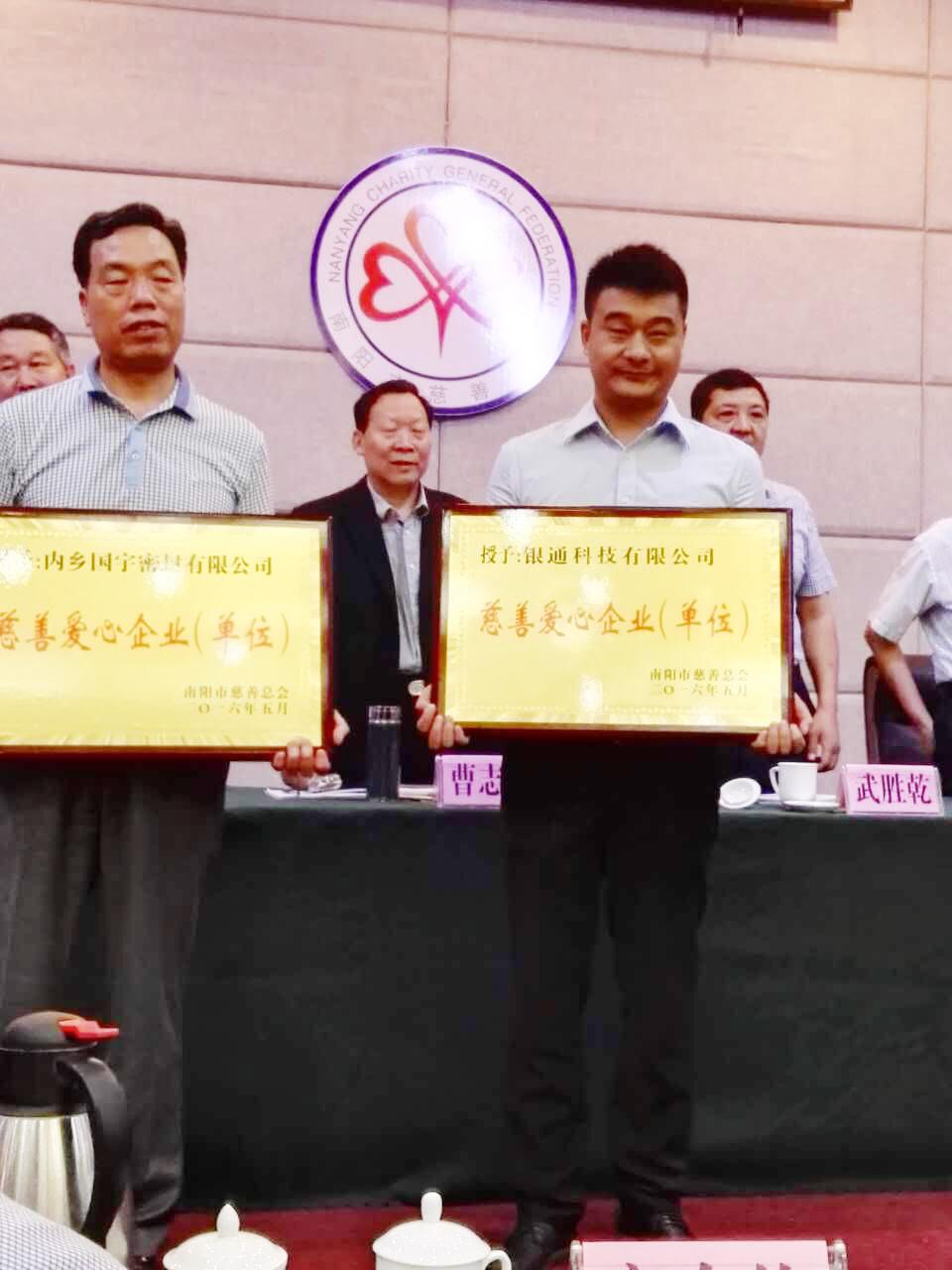 南陽銀通近年來連續(xù)獲得南陽市慈善總會愛心企業(yè),董事長王寶玉先生連年榮獲先進個人榮譽稱號并擔任慈善總會理事會副會長職務。南陽銀通自成立以來始終以“誠信、高效”為理念,以“質(zhì)量為本,服務至上”為宗旨,“慈善和愛心”為義務,努力創(chuàng)造優(yōu)質(zhì)產(chǎn)品,打造良心企業(yè)。