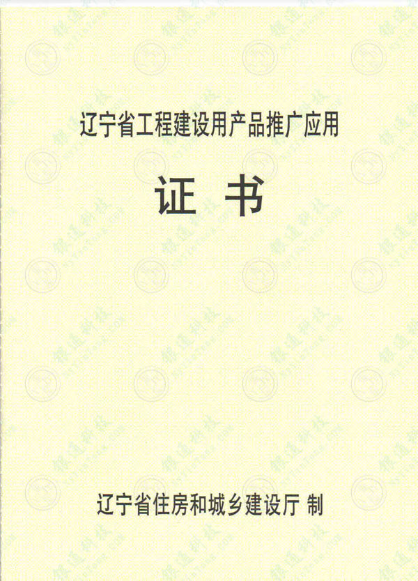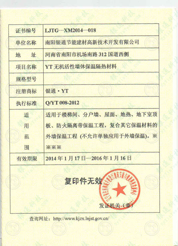 遼寧省工程建設用產品推廣應用證書南陽銀通 證書編號:LJTG-XM2010-126 單位名稱:南陽銀通節能建材高新技術開發有限公司 項目名稱:YT無機活性墻體保溫隔熱材料 注冊商標:銀通、YT 執行標準:Q/YT004-2008 適用范圍:適用于民用建筑工程樓梯間、分戶墻的保溫、隔熱、外墻復合保溫及地熱保溫工程 有效期限:2010年3月15日-2012年4月21日 遼寧省建設科技發展促進中心 遼寧省工程建設用產品推廣應用證書南陽銀通 遼寧省工程建設用產品推廣應用證書南陽銀通 證書編號:LJTG-XM2010-126 單位名稱:南陽銀通節能建材高新技術開發有限公司 項目名稱:YT無機活性墻體保溫隔熱材料 注冊商標:銀通、YT 執行標準:Q/YT004-2008 適用范圍:適用于民用建筑工程樓梯間、分戶墻的保溫、隔熱、外墻復合保溫及地熱保溫工程 有效期限:2010年3月15日-2012年4月21日 遼寧省建設科技發展促進中心 遼寧省工程建設用產品推廣應用證書南陽銀通 遼寧省工程建設用產品推廣應用證書南陽銀通 證書編號:LJTG-XM2010-126 單位名稱:南陽銀通節能建材高新技術開發有限公司 項目名稱:YT無機活性墻體保溫隔熱材料 注冊商標:銀通、YT 執行標準:Q/YT004-2008 適用范圍:適用于民用建筑工程樓梯間、分戶墻的保溫、隔熱、外墻復合保溫及地熱保溫工程 有效期限:2010年3月15日-2012年4月21日 遼寧省建設科技發展促進中心 遼寧省工程建設用產品推廣應用證書南陽銀通