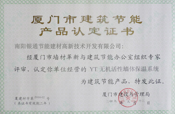 廈門市建筑節能產品認定證書 南陽銀通節能建材高新技術開發有限公司: 經廈門市墻材革新與建筑節能辦公室組織專家評審 認定你單位經營的YT無機活性墻體保溫系統為建筑節能產品,特此發證。 夏建材字第JN04-02號 廈門市建設與管理局 二零零九年九月十二日 注: 此證書有效期兩年,目前已失效,本介紹頁僅為方便用戶了解企業歷史資質,望悉知