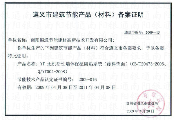 你單位生產的下列建筑節能產品(材料)符合遵義市備案要求,予以備案,特此證明。