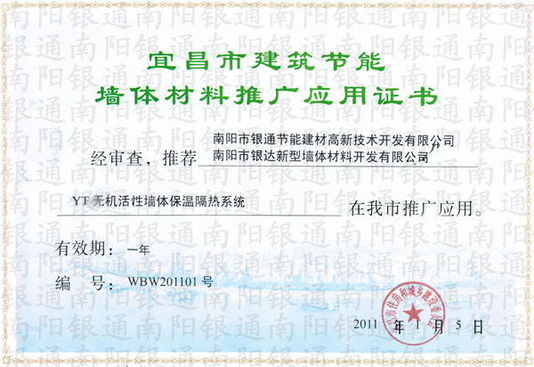 宜昌市建筑節能墻體材料推廣應用證書 經審查,推薦南陽市銀通節能建材高新技術開發有限公司,南陽市銀達新型墻體材料開發有限公司,YT無機活性墻體保溫隔熱系統在我市的推廣應用。 有效期:一年 編號:WBW201101號 2011年1月5日 宜昌市建筑節能墻體材料南陽銀通推廣應用證書