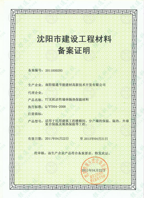 沈陽(yáng)市建設(shè)工程材料備案證明 備案編號(hào):2011000293 生產(chǎn)企業(yè):南陽(yáng)銀通節(jié)能建材高新技術(shù)開(kāi)發(fā)有限公司 產(chǎn)品名稱(chēng):YT無(wú)機(jī)活性墻體隔熱保溫材料 執(zhí)行標(biāo)準(zhǔn):Q/YT004-2008 產(chǎn)品型號(hào):適用于民用建筑工程樓梯間、分戶墻的保溫、隔熱、外墻復(fù)合保溫及地?zé)岜氐裙こ獭?nbsp; 有效日期:2011年04月22日 至2012年04月21日 經(jīng)審核,該生產(chǎn)企業(yè)產(chǎn)品符合備案要求,特發(fā)此證。 沈陽(yáng)市城鄉(xiāng)建設(shè)委員會(huì) 建設(shè)工程材料備案登記專(zhuān)用章 2011年04月22日