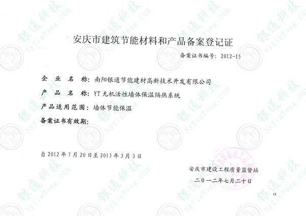 安慶市建筑節(jié)能材料和產(chǎn)品備案登記證 備案證書(shū)編號(hào):2012-15 企業(yè)名稱:南陽(yáng)銀通節(jié)能建材高新技術(shù)開(kāi)發(fā)有限公司 產(chǎn)品名稱:YT無(wú)機(jī)活性墻體保溫隔熱系統(tǒng) 產(chǎn)品適用范圍:墻體節(jié)能保溫 備案證書(shū)有效期:自2012年7月20日至2013年3月3日 安慶市建設(shè)工程質(zhì)量監(jiān)督站 二〇一二年七月二十日