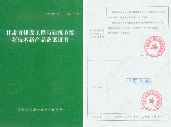 甘肅省建設工程與建筑節(jié)能新技術新產品備案證書 有效期:2011年10月13日 至 2014年10月13日