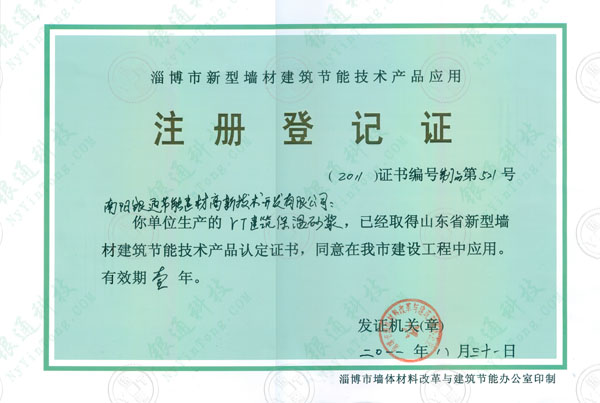 山東淄博市新型墻體建筑節(jié)能技術(shù)產(chǎn)品應(yīng)用注冊登記證2011證書編號第521號 南陽銀通節(jié)能建材高新技術(shù)開發(fā)有限公司 你單位生產(chǎn)的yt建筑保溫砂漿 已經(jīng)取得山東省新型墻材建筑節(jié)能技術(shù)產(chǎn)品認(rèn)定證書 同意在我市建設(shè)工程中應(yīng)用 有效期壹年 發(fā)證機(jī)關(guān) 淄博市墻體材料改革與建筑節(jié)能辦公室 二零零一八月三十一日