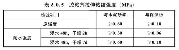 4.0.5 膠粘劑拉伸粘結強度應符合表4.0.5的規定。膠粘劑與保溫板的粘結在原強度、浸水48h且干燥7d后的耐水強度條件下發生破壞時,破壞部位應位于保溫板內。