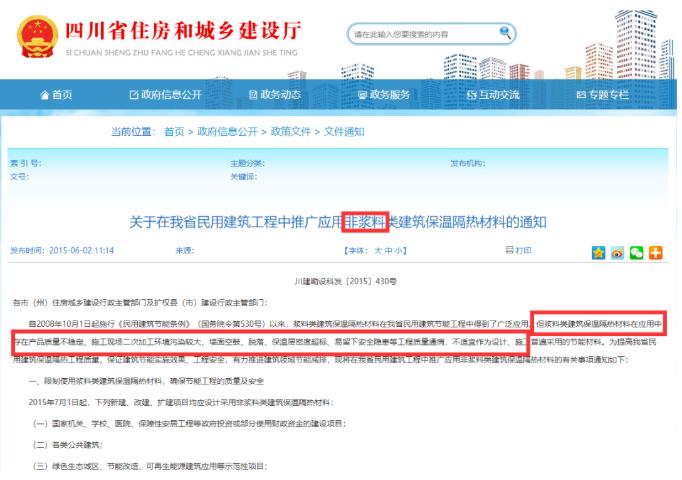 四川省住建廳在2020年6月發(fā)布的關(guān)于發(fā)布建筑保溫材料推廣、限制和禁止產(chǎn)品目錄的公告中限制使用類產(chǎn)品中明確限制范圍:不得用于國家機(jī)關(guān)、學(xué)校、醫(yī)院、保障性安居工程等政府投資或部分使用財政資金的建設(shè)項(xiàng)目;各類公共建筑;綠色生態(tài)城區(qū)、節(jié)能改造、可再生能源建筑應(yīng)用等示范性項(xiàng)目;建筑地上總層數(shù)超過6層(含6層)的建設(shè)項(xiàng)目;以上項(xiàng)目中不得用于外墻、屋面、樓地面作為主要保溫隔熱材料使用。