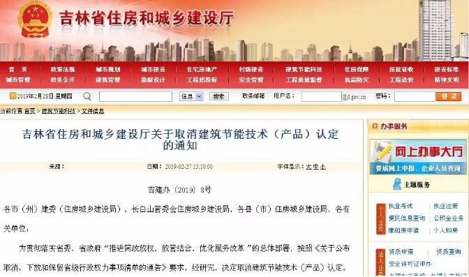 吉林省住房和城鄉建設廳關于取消建筑節能技術(產品)認定的通知