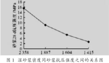 用濕砂漿密度表示建筑砂漿中的空氣含量,用灰砂質(zhì)量比表示砂漿中的水泥含量,濕砂漿密度同砂漿抗壓強(qiáng)度之間的關(guān)系圖如圖1所示。