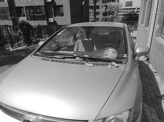今年5月中旬的一個傍晚,從市外趕回家的董先生照常把車停在老地方,“那時候沒有警戒線,我也不知道不能停在那里。第二天傍晚,熱心鄰居通過車上留的電話聯(lián)系我,說車被砸了。”董先生說,得到消息后,他立刻到現(xiàn)場查看,此時前擋風玻璃右下角碎成蜘蛛狀,機關(guān)蓋上散落著墻磚,也被砸出坑。“墻磚應(yīng)該是用水泥砌在樓體上的,質(zhì)感有點像瓷磚,還挺硬的。”董先生回憶道,眼前的景象讓他心驚不已,“幸好我當時沒在車附近,否則就沒命了。”董先生說,事后他也聯(lián)系過物業(yè),但得到的說法和記者得到的一樣,董先生只好自認倒霉,花了3000元修理擋風玻璃和機關(guān)蓋,從此董先生就把車停在距離家10分鐘路程的地方。